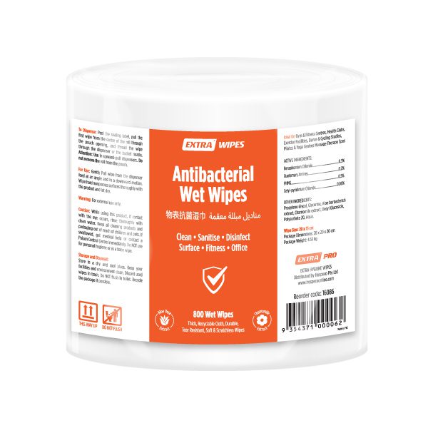 Extra Hygiene Antibacterial Wet Wipes provide powerful cleaning, sanitising, and disinfection, eliminating 99.9% of germs and bacteria without alcohol. Designed for high-traffic areas, these extra-thick, tear-resistant wipes are gentle on surfaces and skin, thanks to Aloe Vera and Chamomile Extract.
